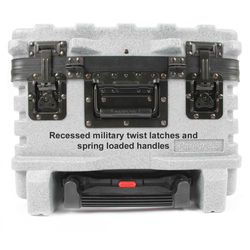 The Front Pull has its (4) wheels mounted on the 18" back of the case for stability. The telescopic handle extends to 42" with tubes 8.5" wide, 4 sealed ball bearing wheels, 5 year guarantee on the case and lifetime guarantee on all hand tools. Available in 4 depths, and 6 colors. This kit includes the tool case, tool pallets, and 75 tools listed below.
