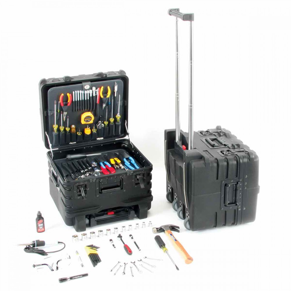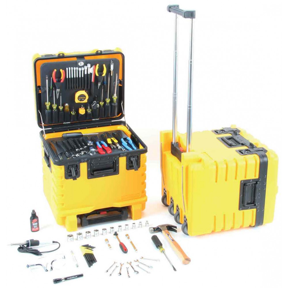 The Front Pull has its (4) wheels mounted on the 18" back of the case for stability. The telescopic handle extends to 42" with tubes 8.5" wide, 4 sealed ball bearing wheels, 5 year guarantee on the case and lifetime guarantee on all hand tools. Available in 4 depths, and 6 colors. This kit includes the tool case, tool pallets, and 88 tools listed below.